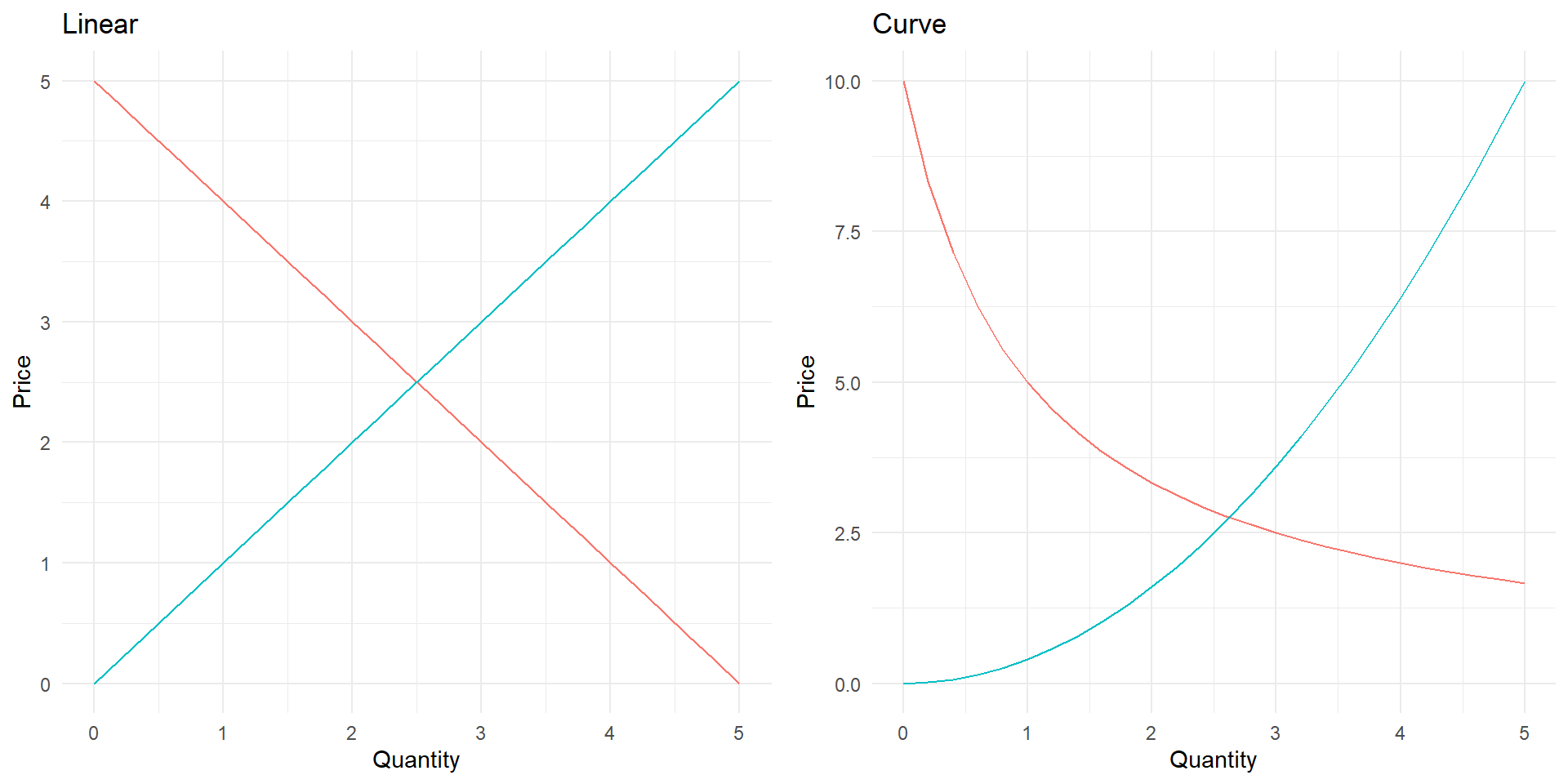 quantity: equally spaced grid on the x-axis between 0 and 5.demand: downward sloping linear line.supply: upward-sloping linear line.demandCurve: downward sloping convex function.supplyCurve: upward sloping convex function.*_right: right-shifted version of demand and supply*can be supply, demand, supplyCurve or demandCurve.*_left: left-shifted version of demand and supply (linear or curved).